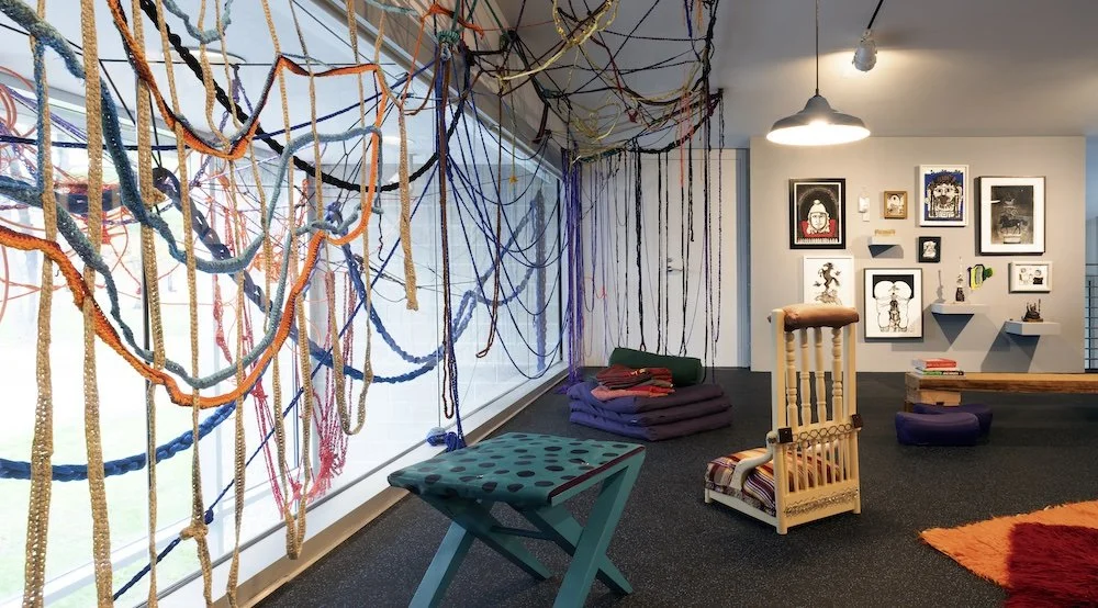 These questions and many more are at the heart of Sheila Pepe’s new immersive installation on the Tang Museum’s mezzanine. Drawing on Pepe’s ongoing interest in the material culture of religion, sociology, queer theory, ancient Greece and Rome, and the Silk Road, When & Where We Rest presents the objects that support our bodies during contemplation, ritual, and sleep. The installation is furnished for visitors to gather as individuals or groups, providing space for both rest and discourse. An exploration of the meanings and implications of rest in the past, present, and future, the project invites us to consider rest’s complexity, subjectivity, and multiplicity—and the rest is up to you.